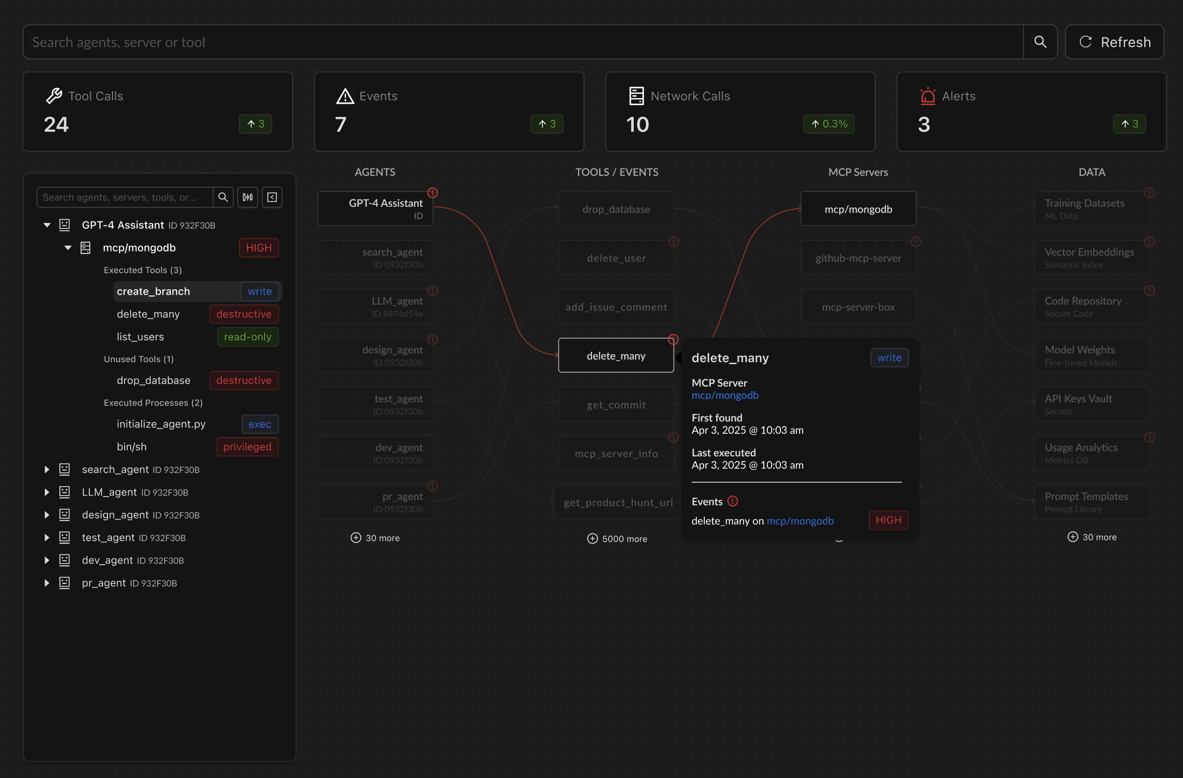 The Agentic Action Graph shows every agentic action path in real time — from agents to tools, data, and runtime — so you can see what happened and where to enforce.
